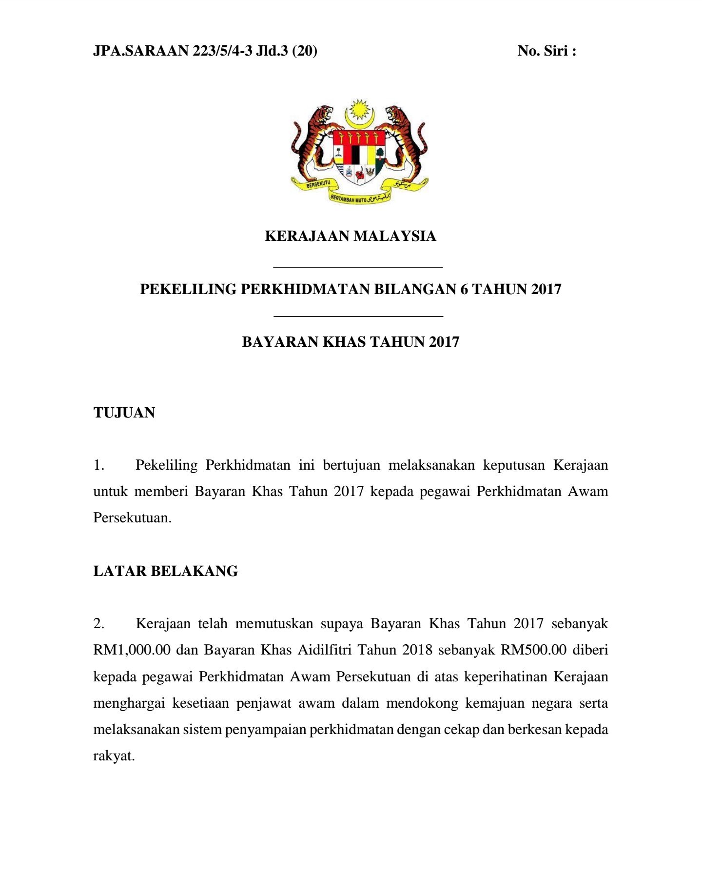 Kerajaan berharap dengan pemberian Bantuan Khas ini dapat meringankan beban kewangan kepada penjawat awam dan pesara bagi persiapan Hari Raya. Pembayaran bagi bantuan khas ini akan dibuat sebelum 9 Jun 2017. Pekeliling Bonus Raya 2019.